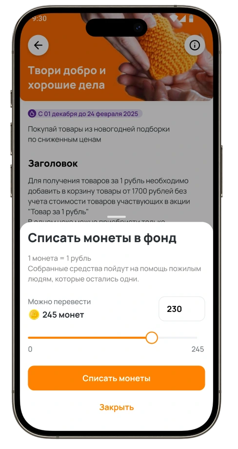 Вводи сумму и списывай монеты кешбэка на благотворительность